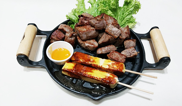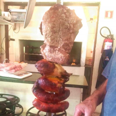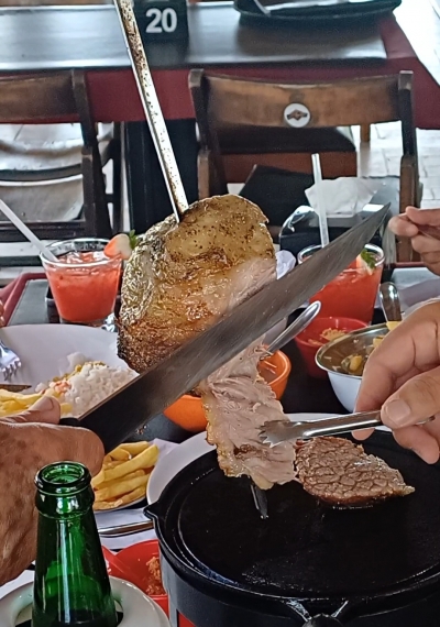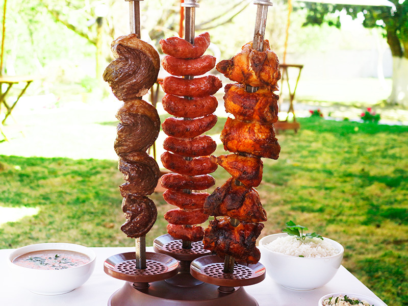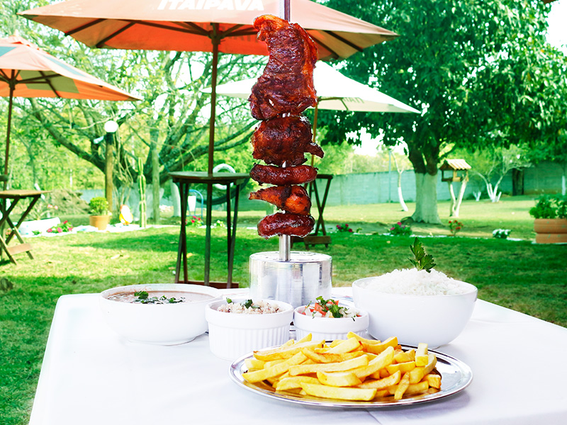Linguiça Toscana, Coxa e Sobrecoxa, Alcatra. Acompanha arroz, feijão, farofa, vinagrete e fritas. Serve 2 pessoas