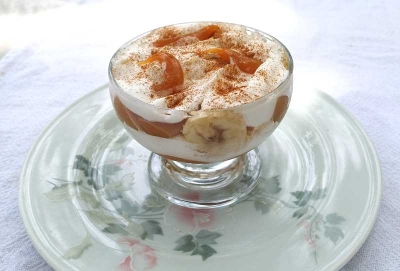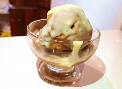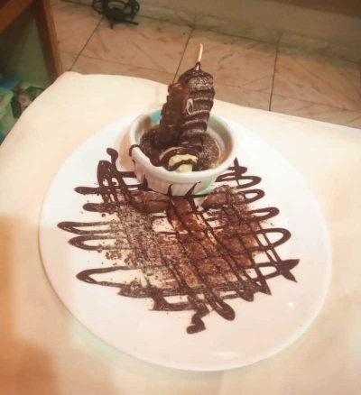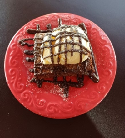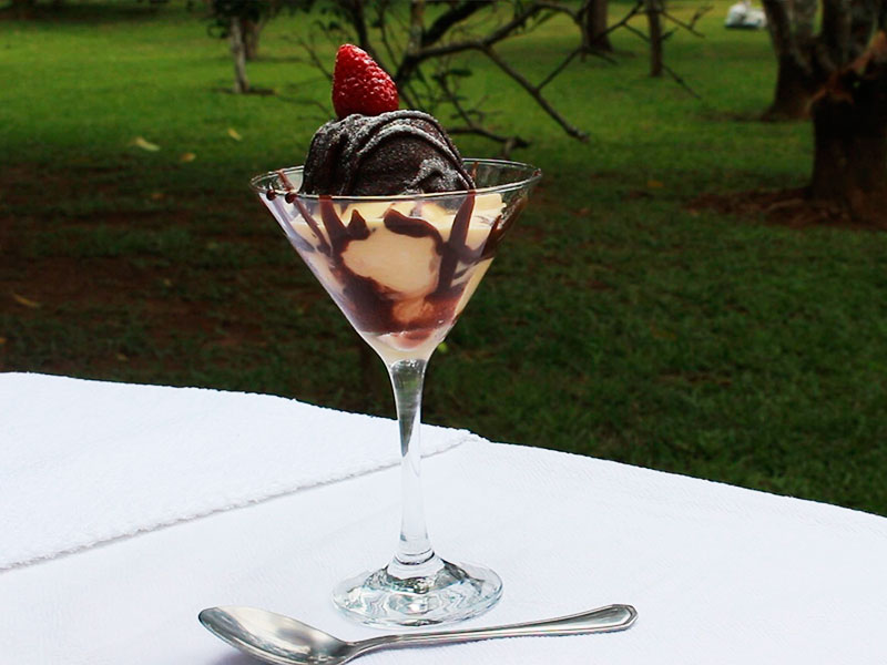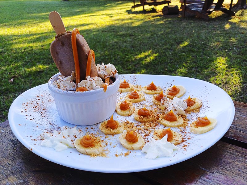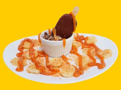 Delicioso e cremoso bolo de chocolate, com sorvete de palito, calda cremosa de doce de leite, banana, farofa de bolacha e chantilly.