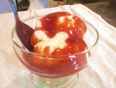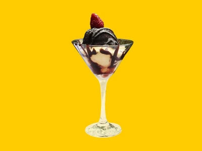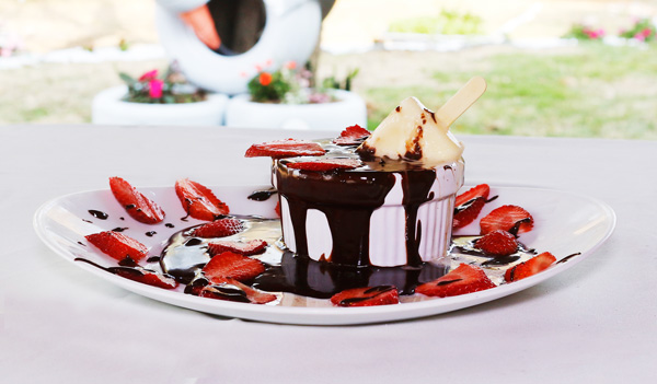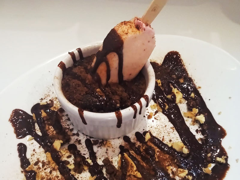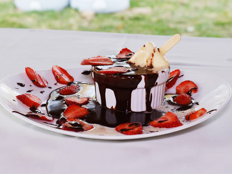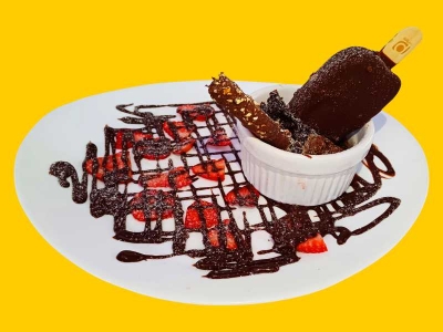 Explosão de Sabor! Bolo de chocolate crocante por fora e cremoso por dentro, sorvete de palito, calda cremosa de chocolate e pedaços de morango fatiado. Indiscutivelmente uma delícia.