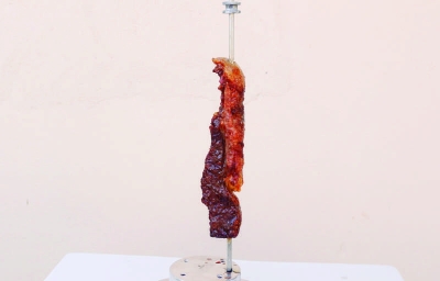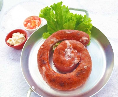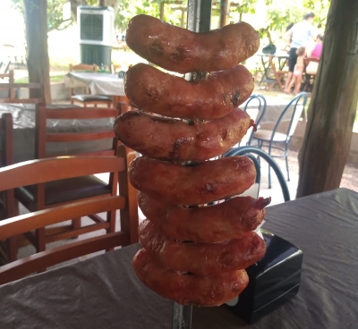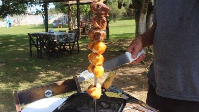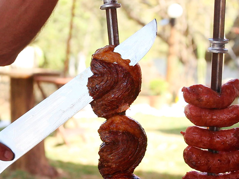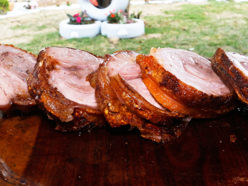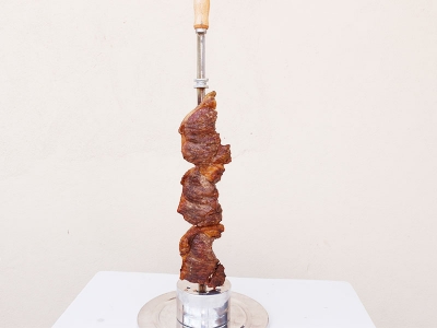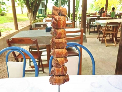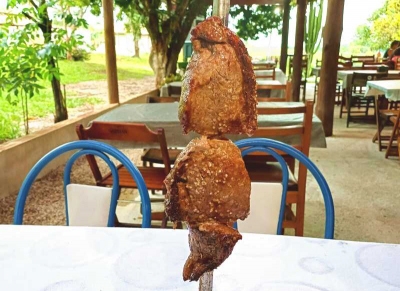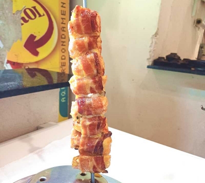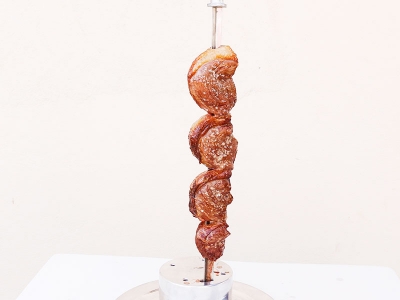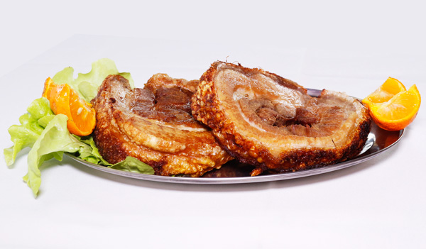 Pedaço selecionado de torresmo enrolado, assado lentamente na brasa e, por fim, pururucado na fritadeira.