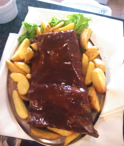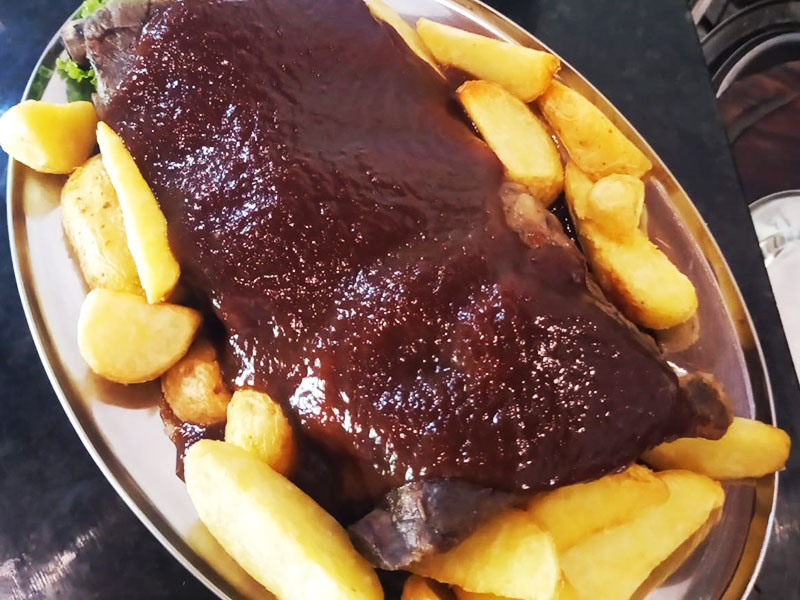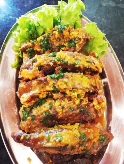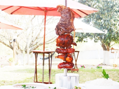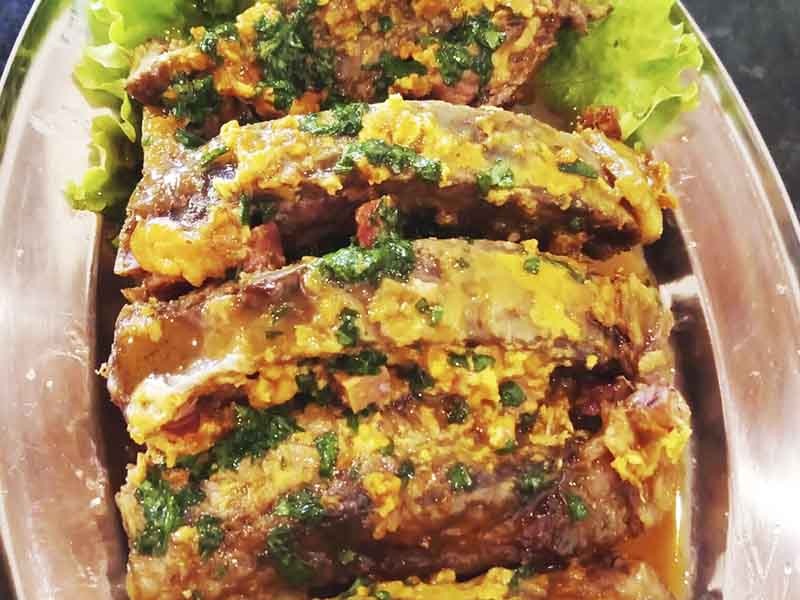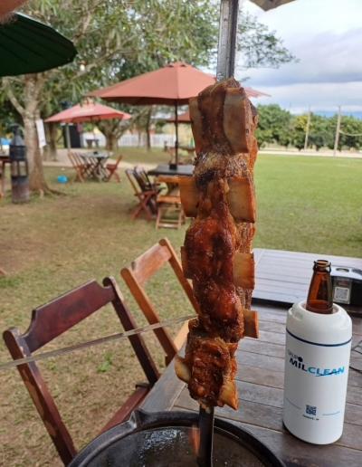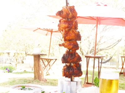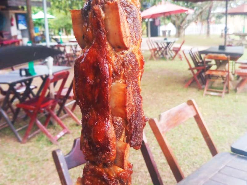 temperado, assado lentamente em brasa e finalizado na fritadeira. Acompanha coulis de laranja apimentado.