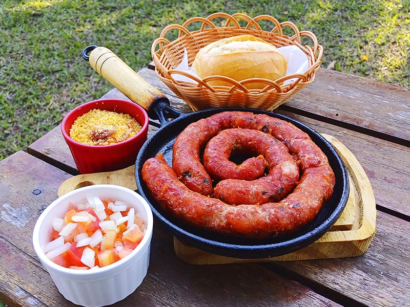 Linguiça Toscana, Coxa e Sobrecoxa, Contrafilé. Acompanha arroz, feijão, farofa, vinagrete e fritas. Serve 2 pessoas.