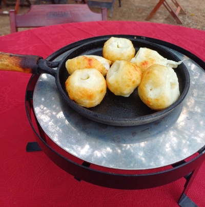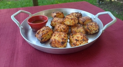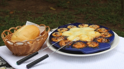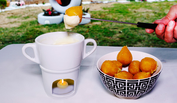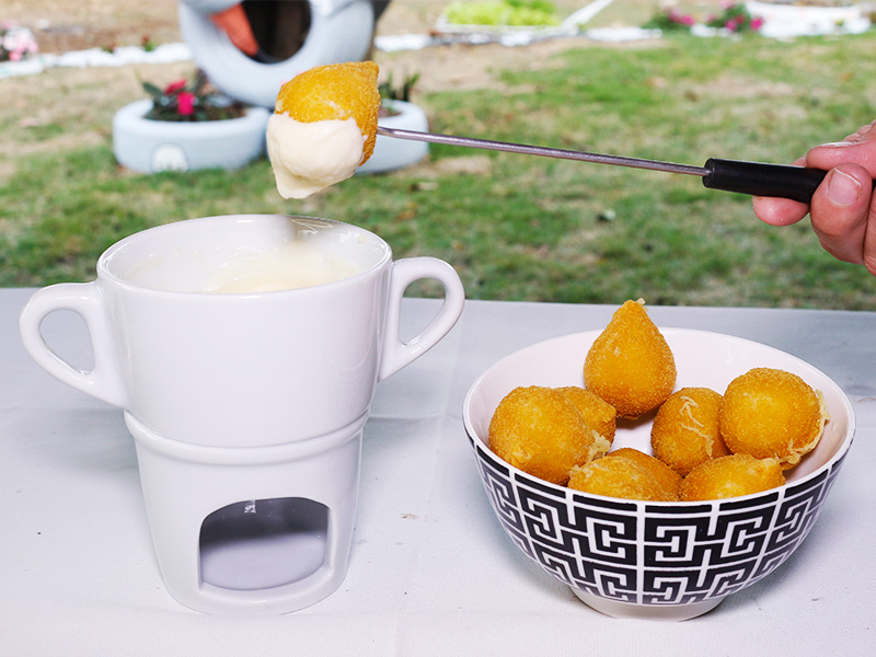 São 12 mini deliciosas coxinhas de frango servidas com rechaud de Catupiry Original cremoso borbulhando. Basta passar a mini coxinha no Catupiry Original.