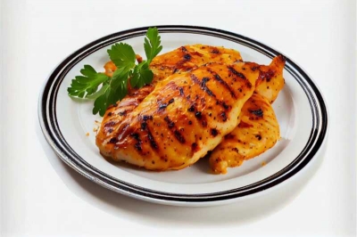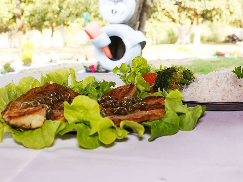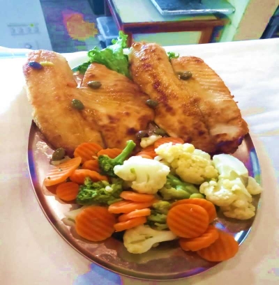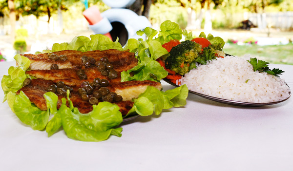 Grelhado com molho de alcaparras. Acompanha arroz e legumes salteados na manteiga. Serve 2 pessoas.