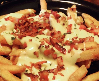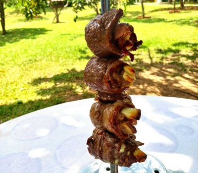 Lentamente assada, temperada com mostarda e generosamente recheada com bacon e muçarela. Acompanha arroz, farofa e fritas. Serve 2 pessoas
