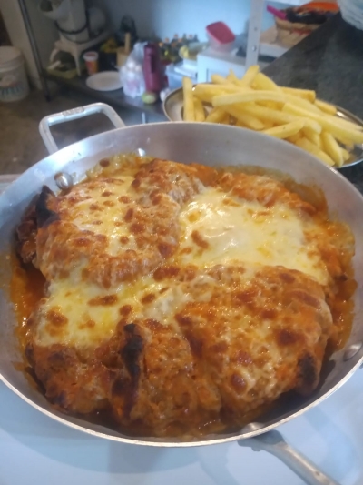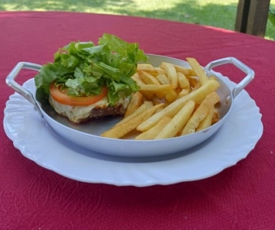 Acompanha arroz, feijão, farofa, vinagrete e fritas. Serve 2 pessoas. Recheada com queijo coalho e bacon.